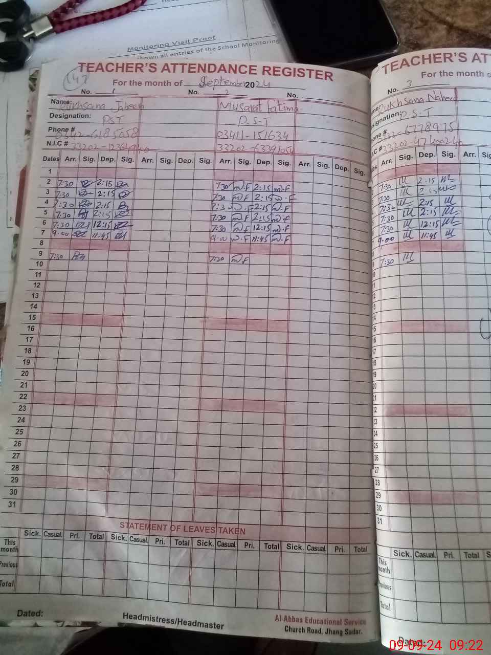 | CNIC | Full Name | Designation | R/C | Absence During Last Calender Month |