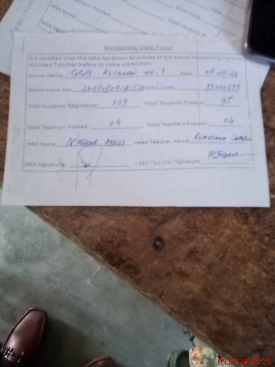 | Attendance Register | Head Teacher | MEA with School | Visit Proof |