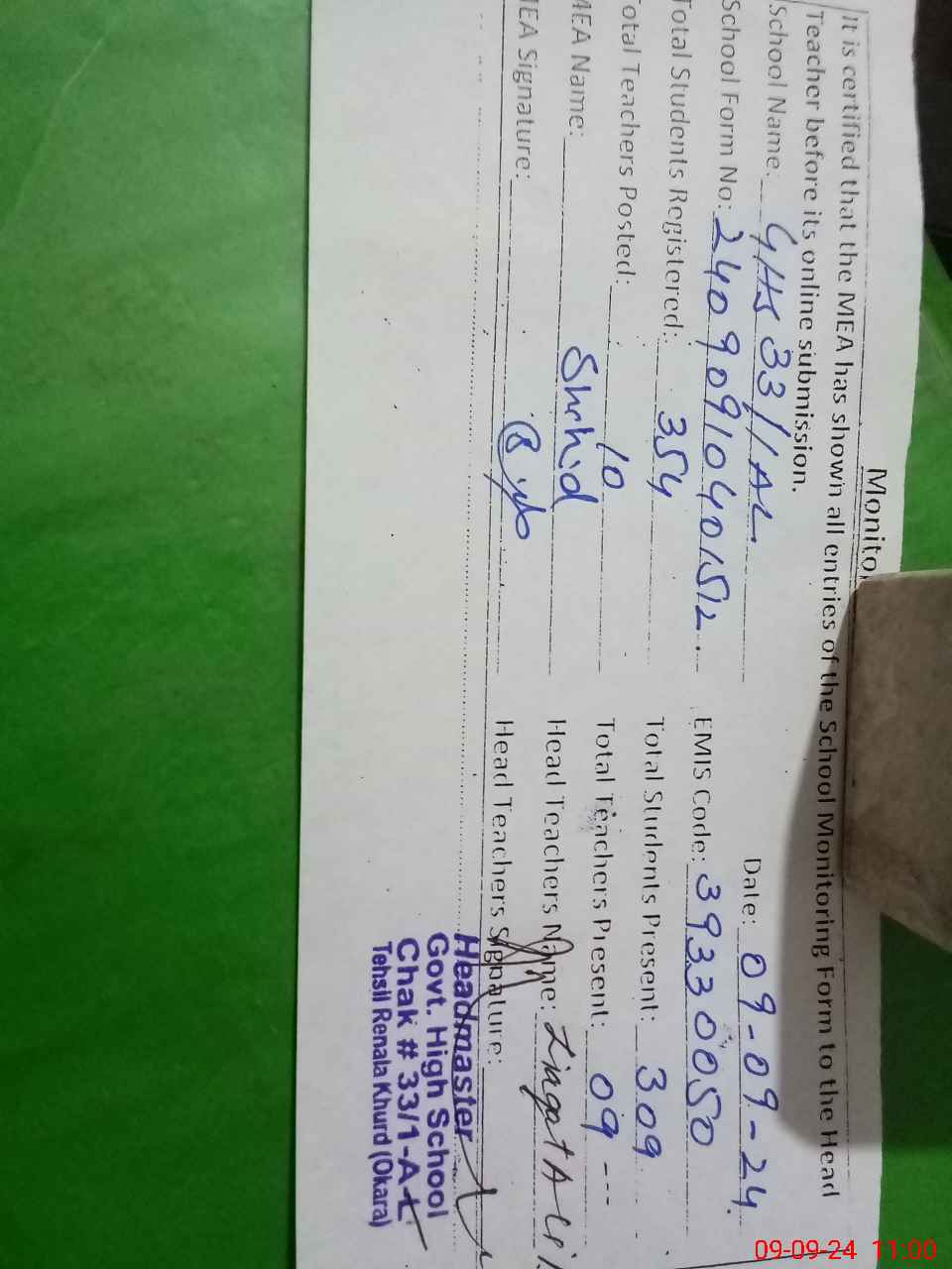 | EMIS Code: 39330050 | Name of School: GHS 33 1 AL OKARA | |||