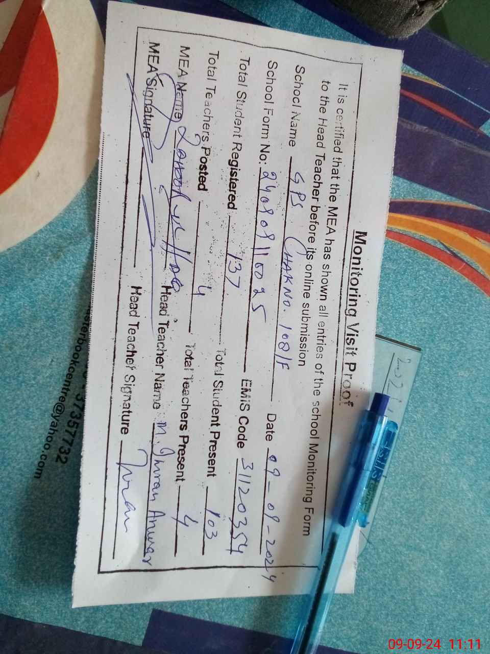 | Attendance Register | Head Teacher | MEA with School | Visit Proof |
