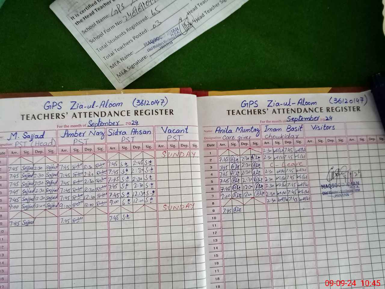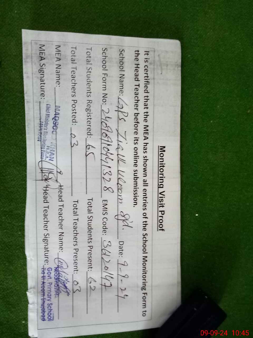 | Attendance Register | Head Teacher | MEA with School | Visit Proof |