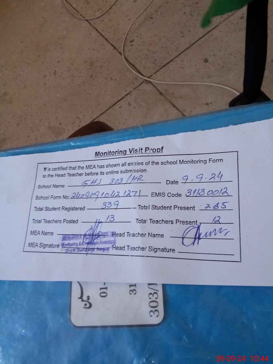 | EMIS Code: 31130012 | Name of School: GHS CHAK 303/HR | |||