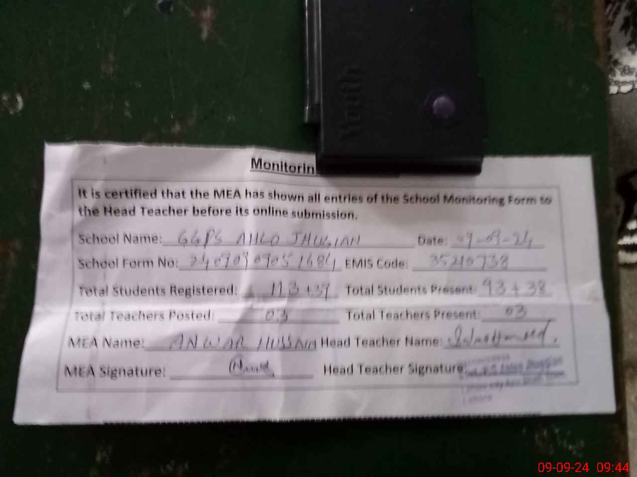 | Monitoring Date: 09-09-2024 | Start Time: 09-09-2024 09:05 AM | End Time: 09-09-2024 09:47 AM | Name of MEA: AN**** HU**** | |