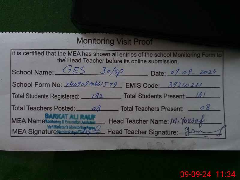 | EMIS Code: 39210221 | Name of School: GES CHAK NO. 30 SP | |||