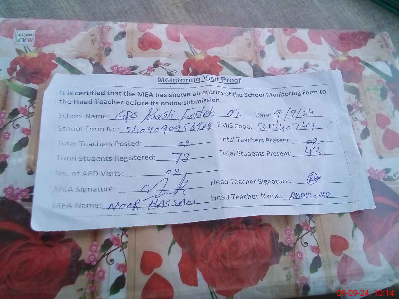 | Attendance Register | Head Teacher | MEA with School | Visit Proof |