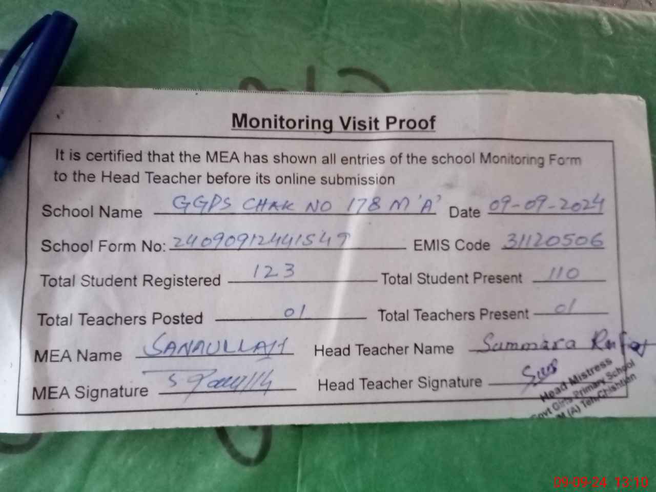 | Attendance Register | Head Teacher | MEA with School | Visit Proof |