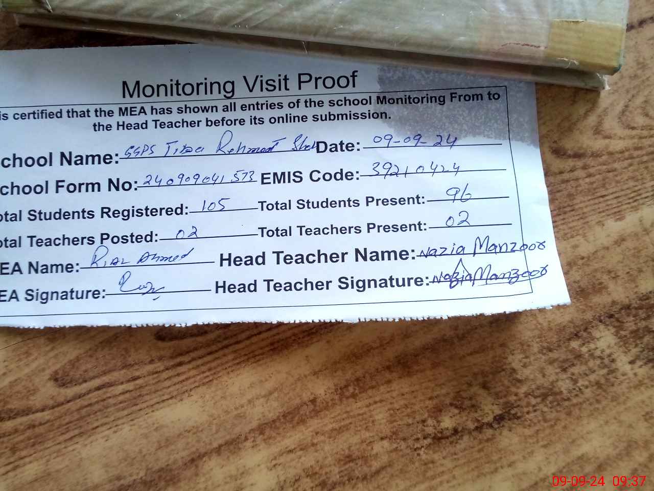 | Attendance Register | Head Teacher | MEA with School | Visit Proof |