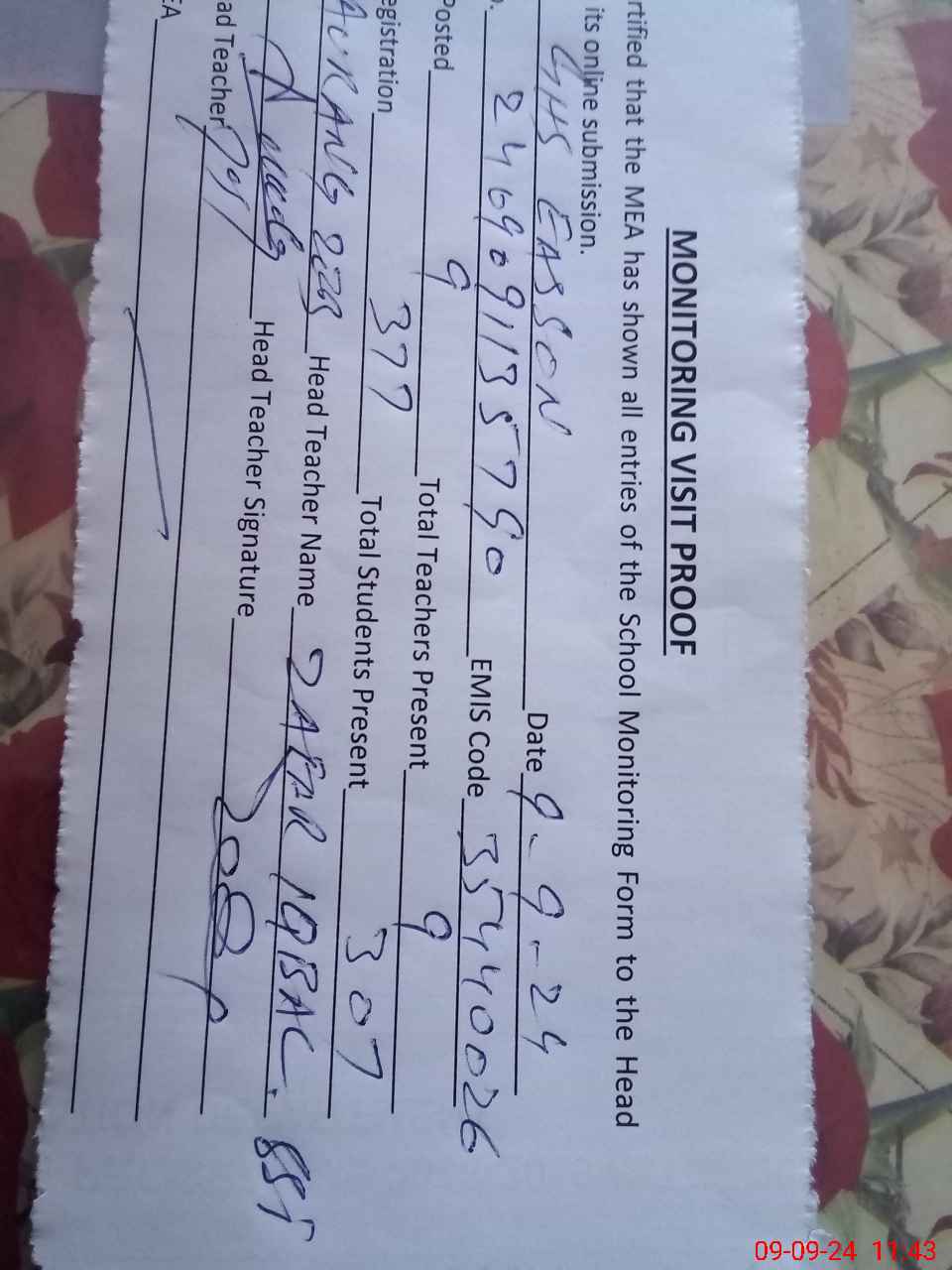 | Attendance Register | Head Teacher | MEA with School | Visit Proof |