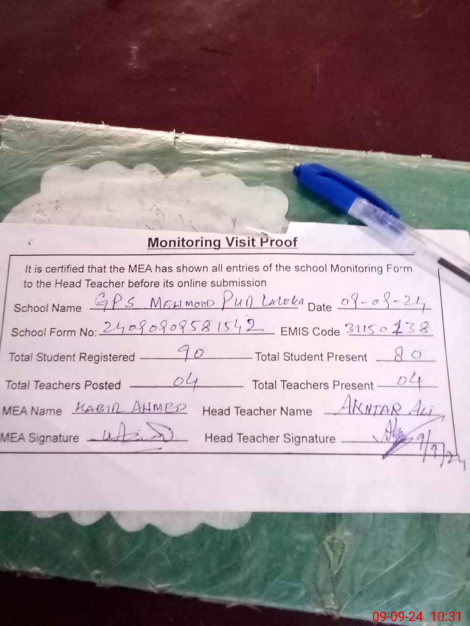 | Attendance Register | Head Teacher | MEA with School | Visit Proof |