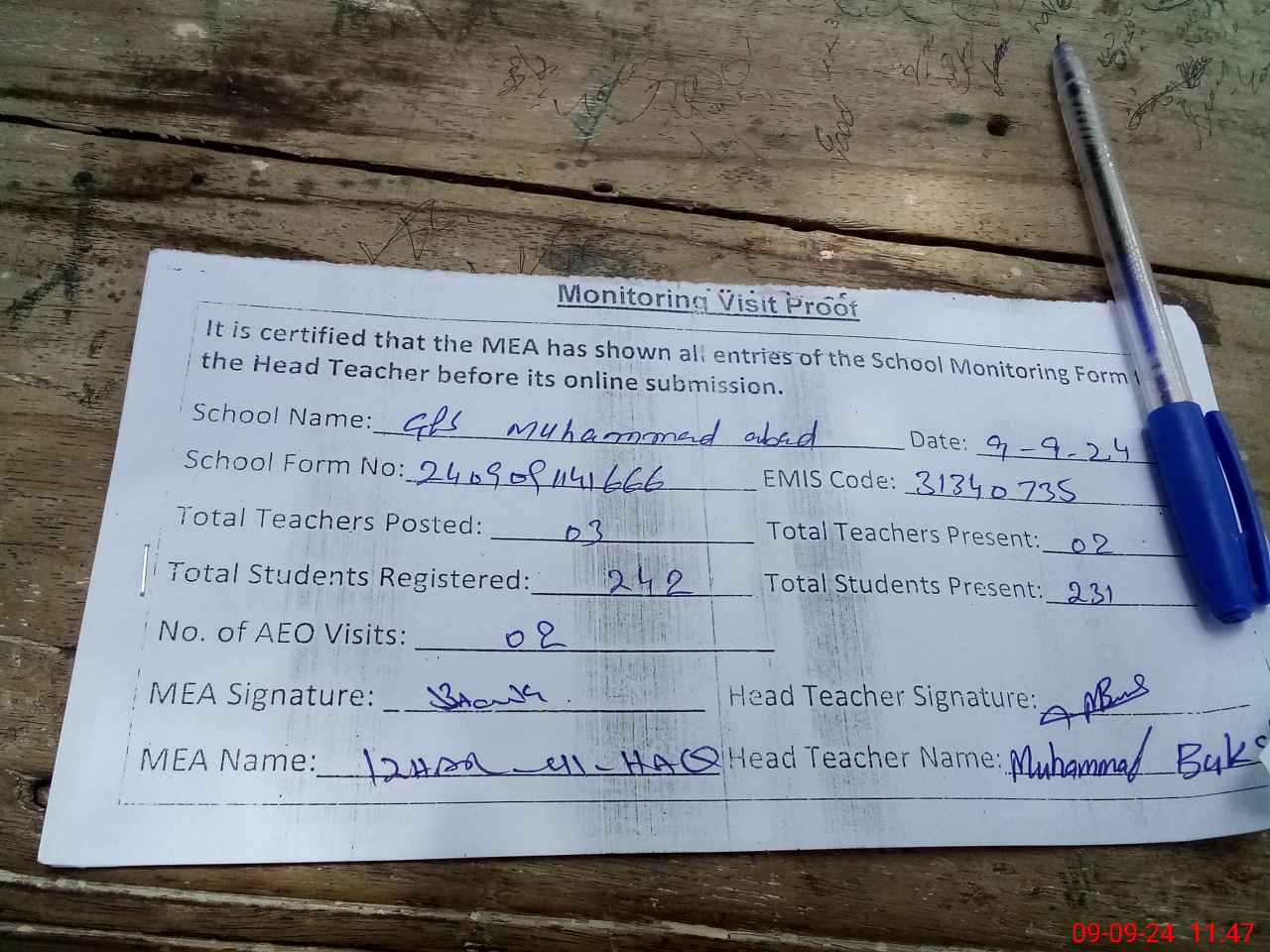 | Attendance Register | Head Teacher | MEA with School | Visit Proof |