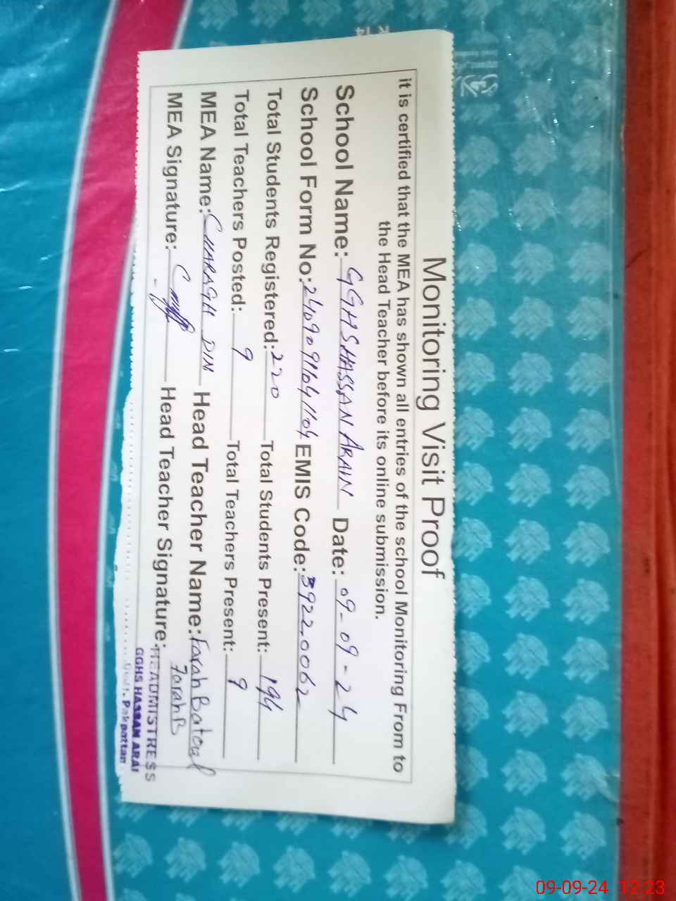 | EMIS Code: 39220062 | Name of School: GGHS HASSAN ARAIN | |||