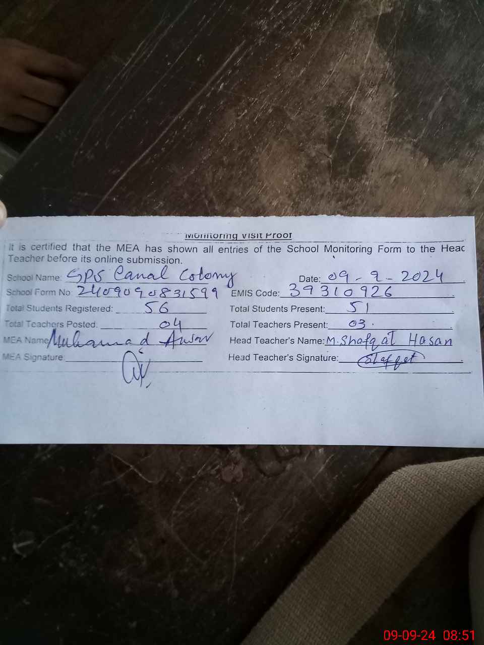 | Attendance Register | Head Teacher | MEA with School | Visit Proof |