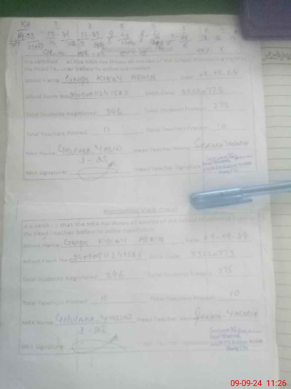 | Attendance Register | Head Teacher | MEA with School | Visit Proof |