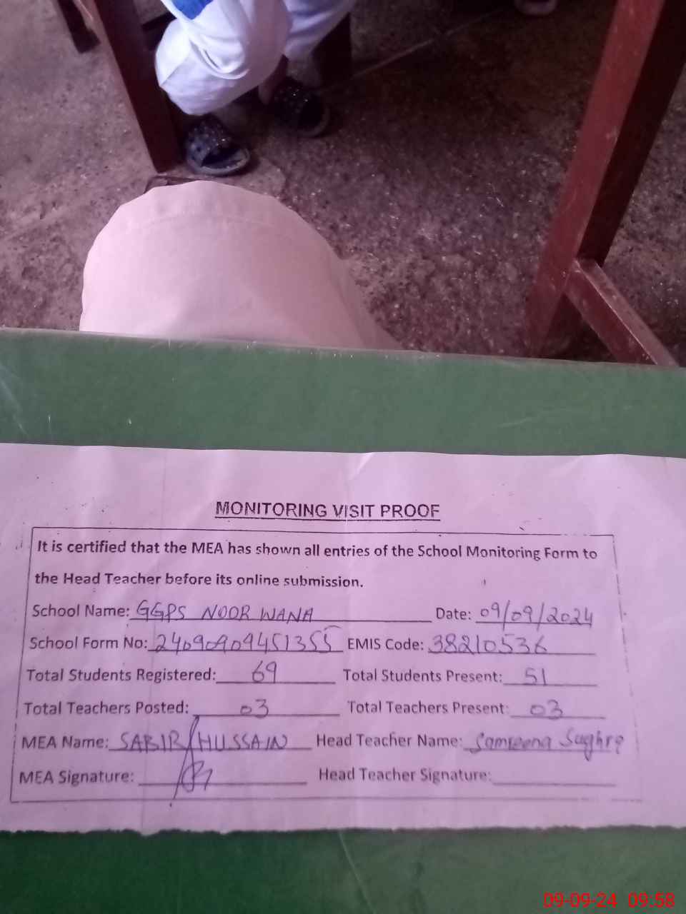 | Attendance Register | Head Teacher | MEA with School | Visit Proof |