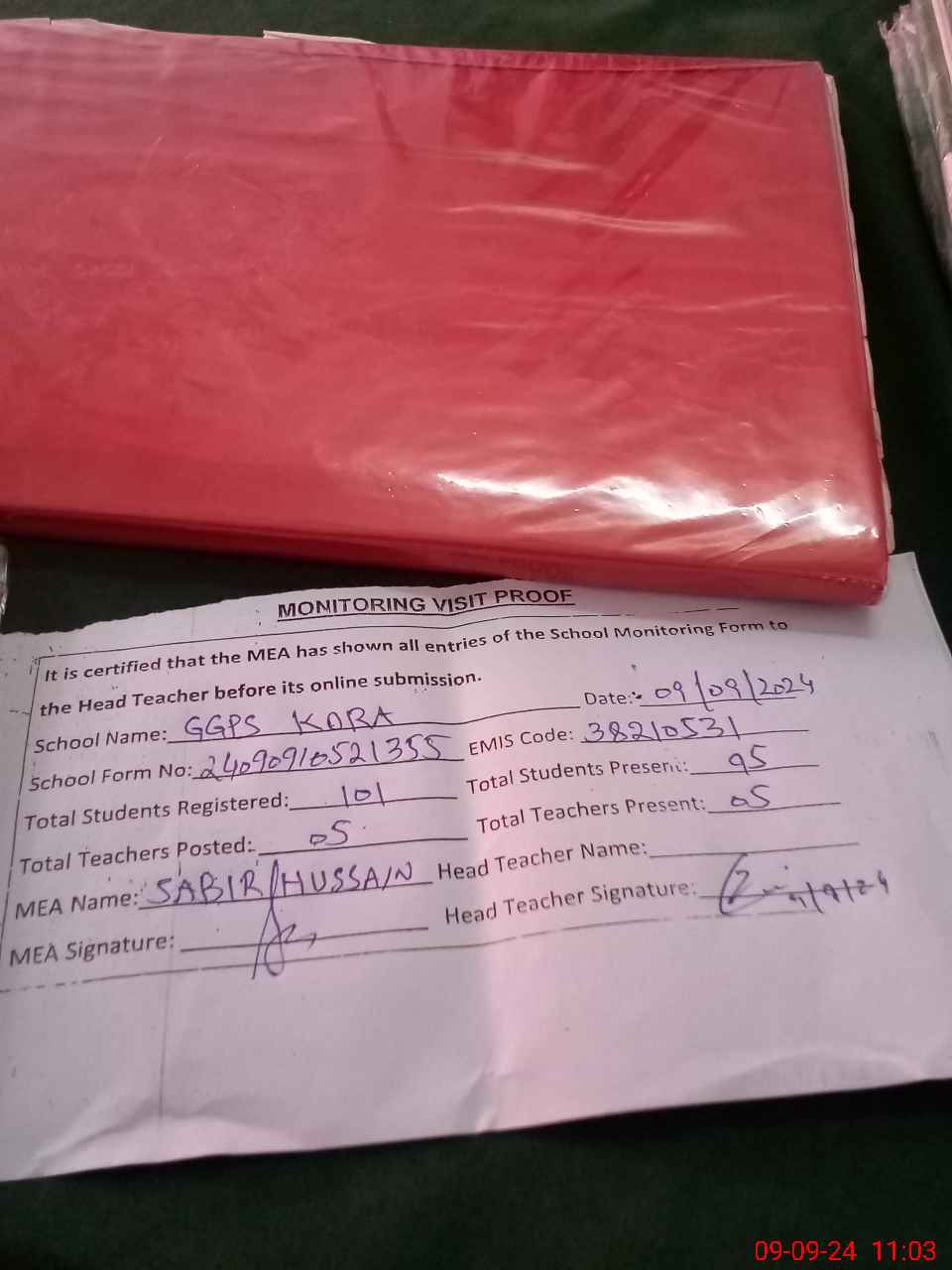 | Attendance Register | Head Teacher | MEA with School | Visit Proof |