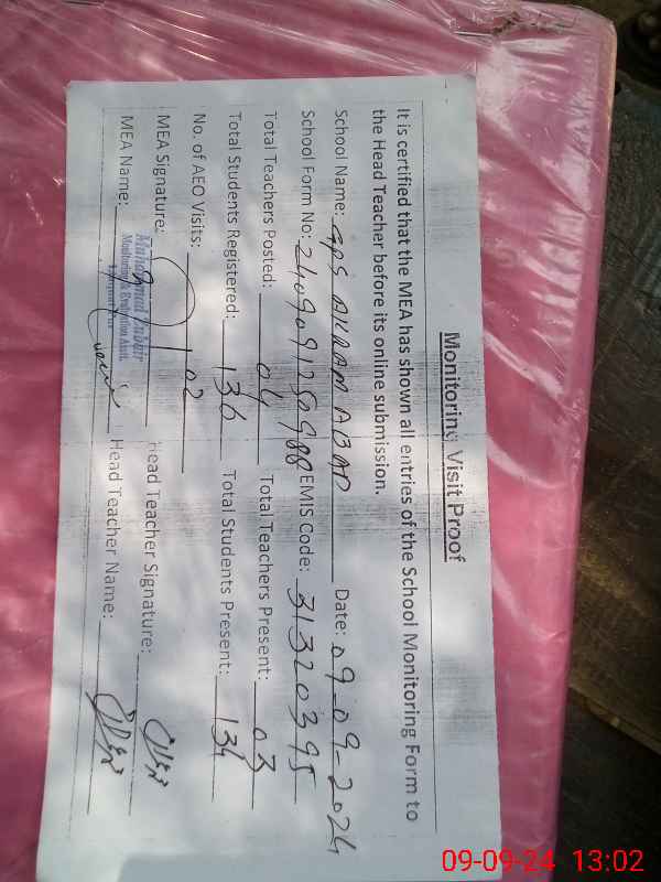 | Attendance Register | Head Teacher | MEA with School | Visit Proof |