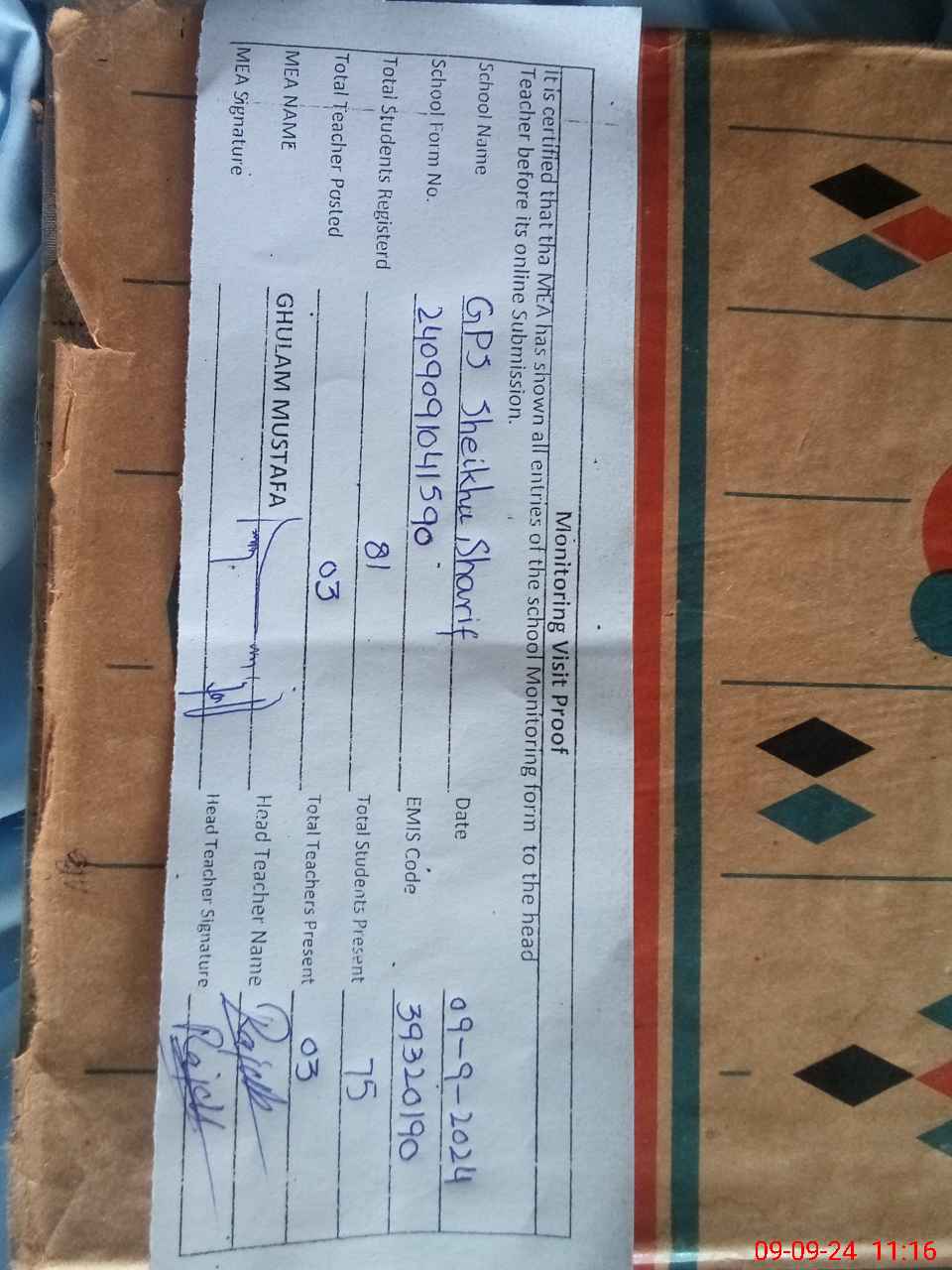 | Attendance Register | Head Teacher | MEA with School | Visit Proof |