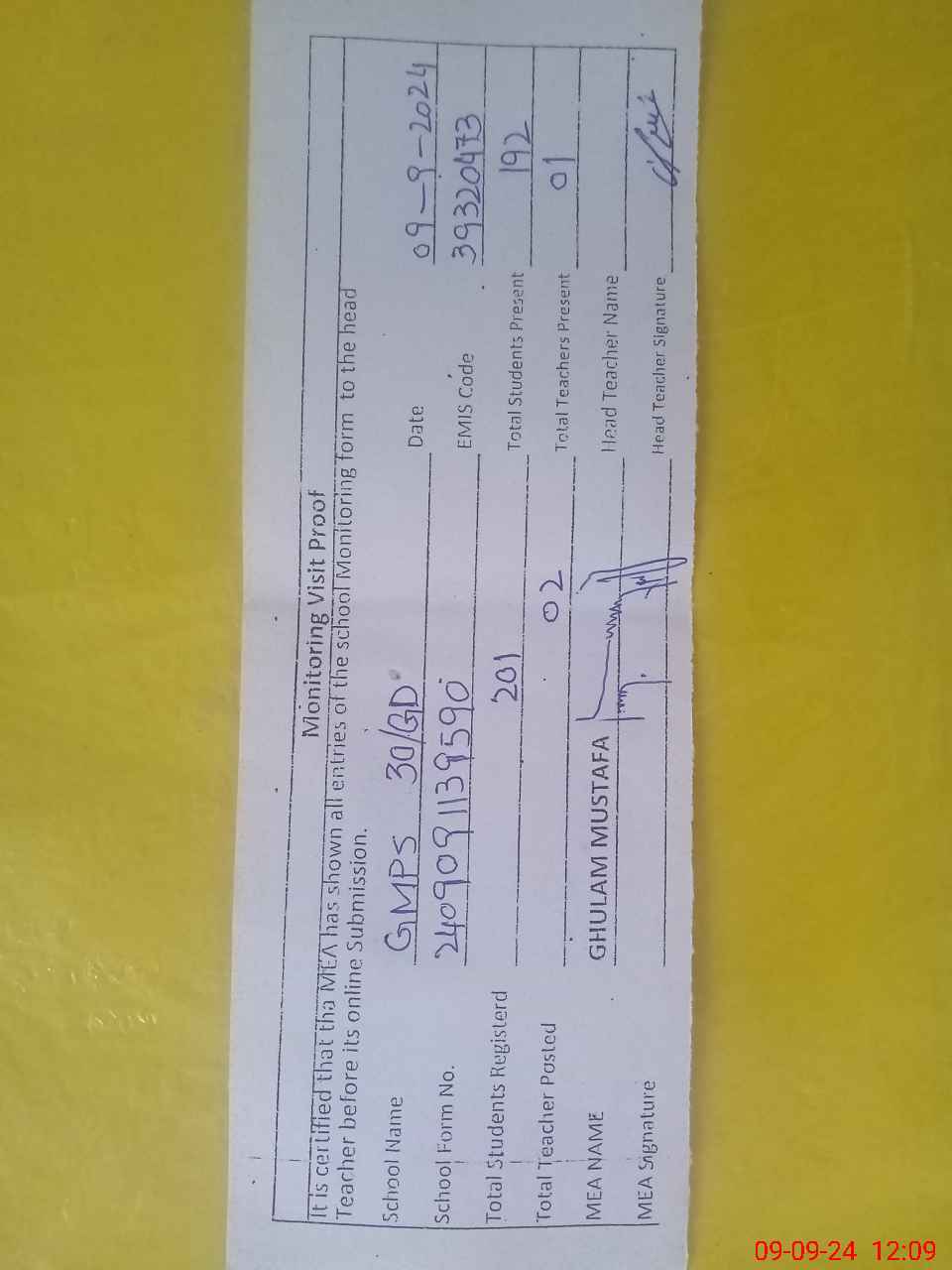 | Attendance Register | Head Teacher | MEA with School | Visit Proof |