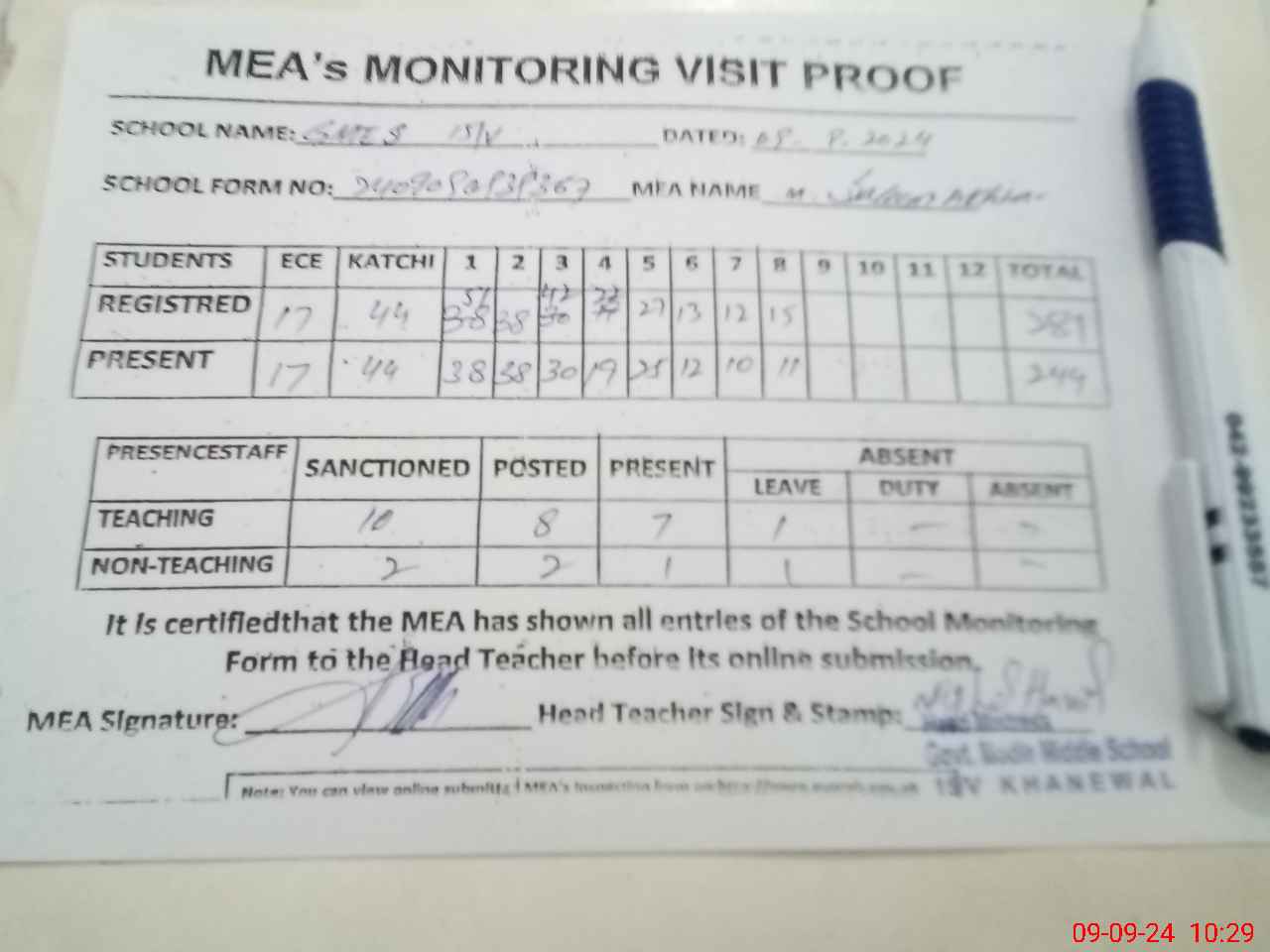 | Attendance Register | Head Teacher | MEA with School | Visit Proof |