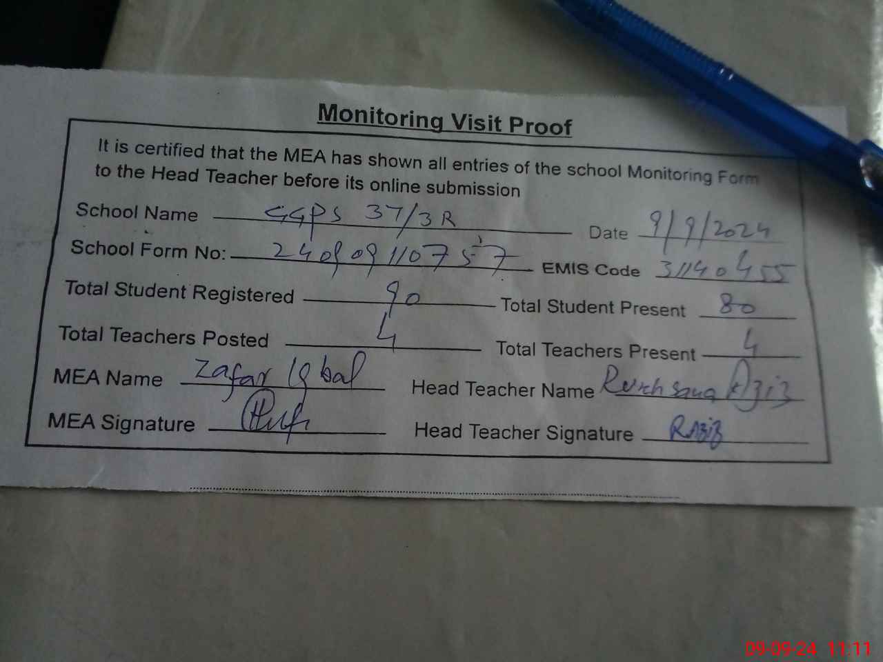 | Attendance Register | Head Teacher | MEA with School | Visit Proof |