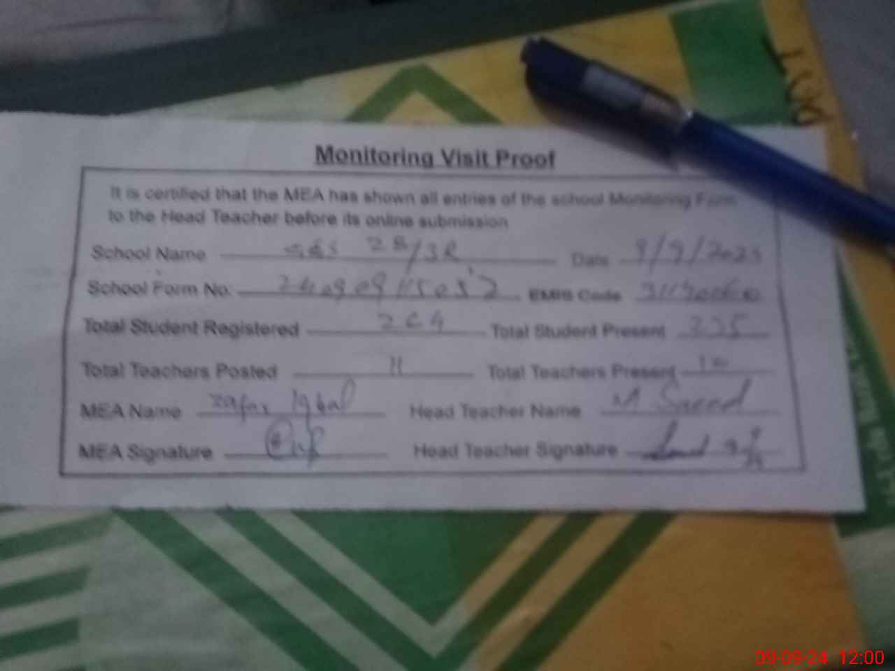 | Attendance Register | Head Teacher | MEA with School | Visit Proof |