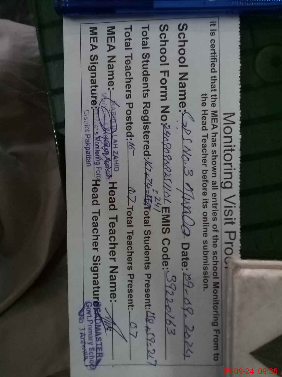 | Attendance Register | Head Teacher | MEA with School | Visit Proof |