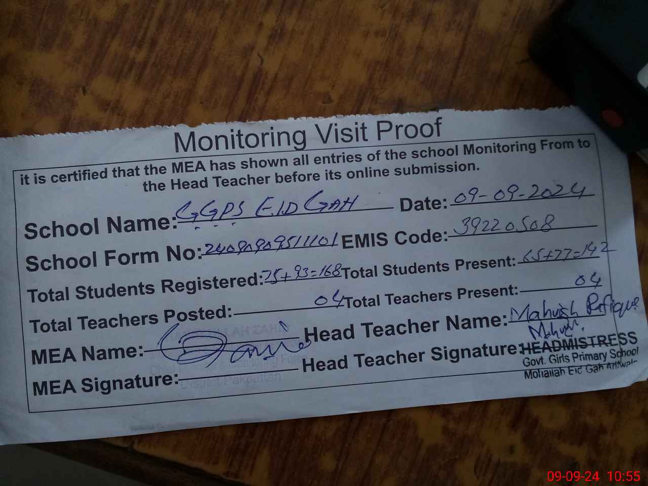 | Attendance Register | Head Teacher | MEA with School | Visit Proof |