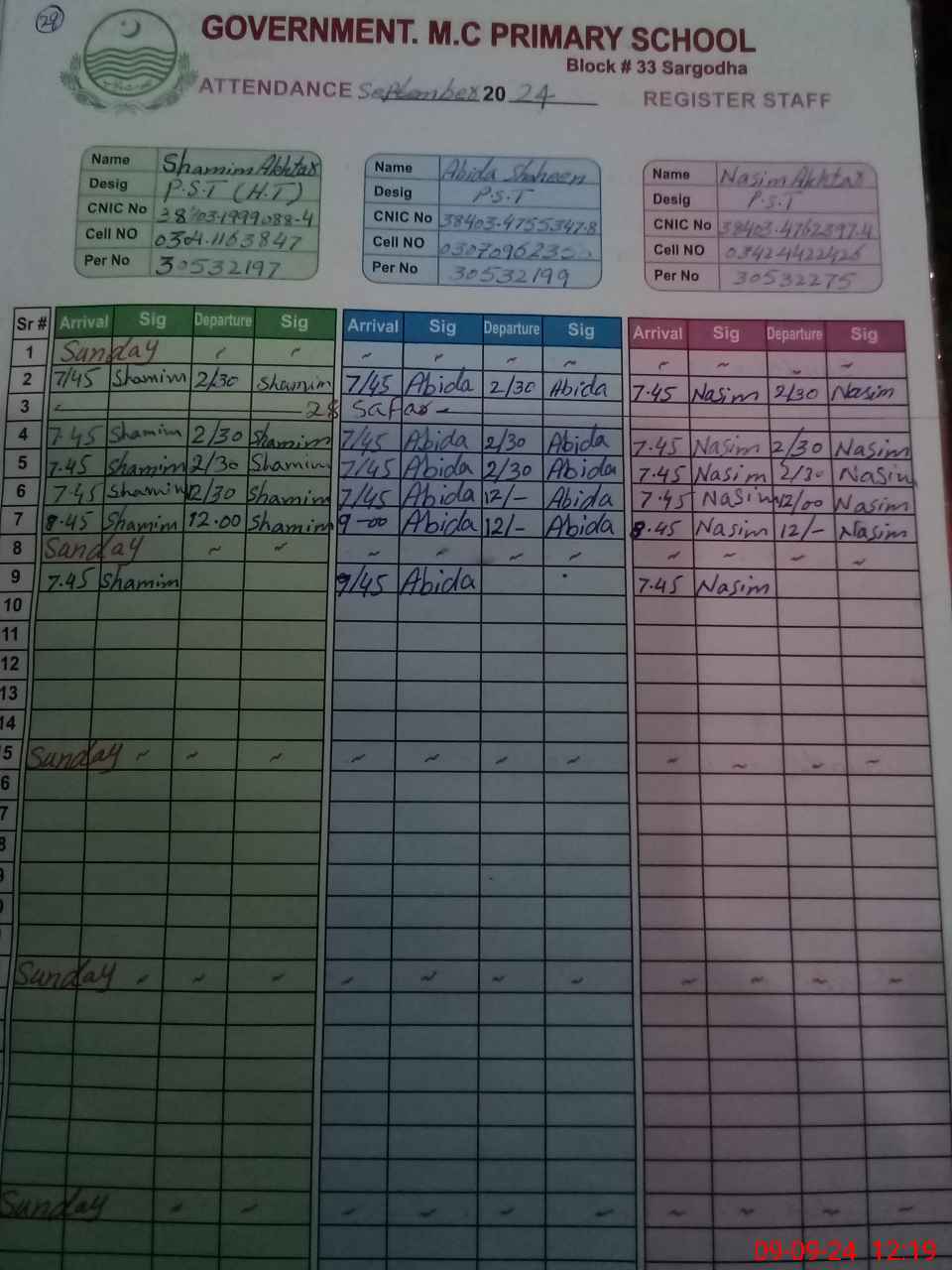 | CNIC | Full Name | Designation | R/C | Absence during last cal. month |
