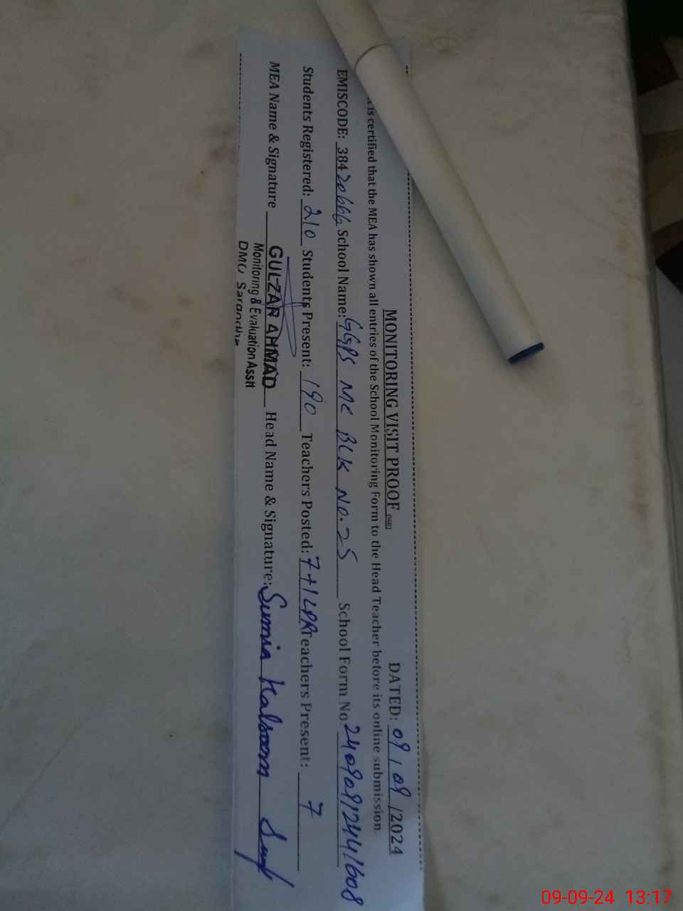 | Attendance Register | Head Teacher | MEA with School | Visit Proof |