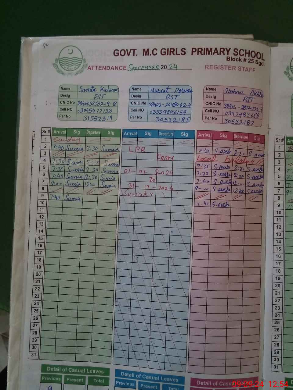 | CNIC | Full Name | Designation | R/C | Absence During Last Calender Month |