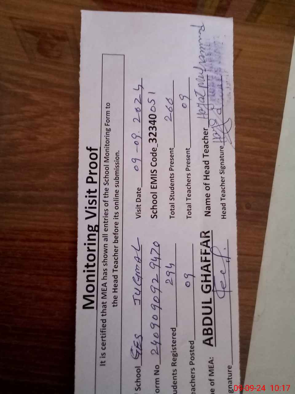 | Attendance Register | Head Teacher | MEA with School | Visit Proof |