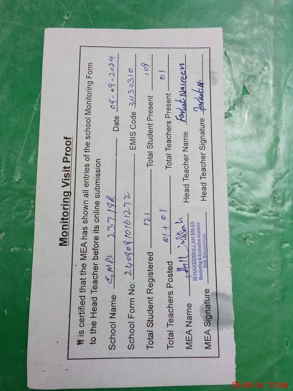 | Attendance Register | Head Teacher | MEA with School | Visit Proof |