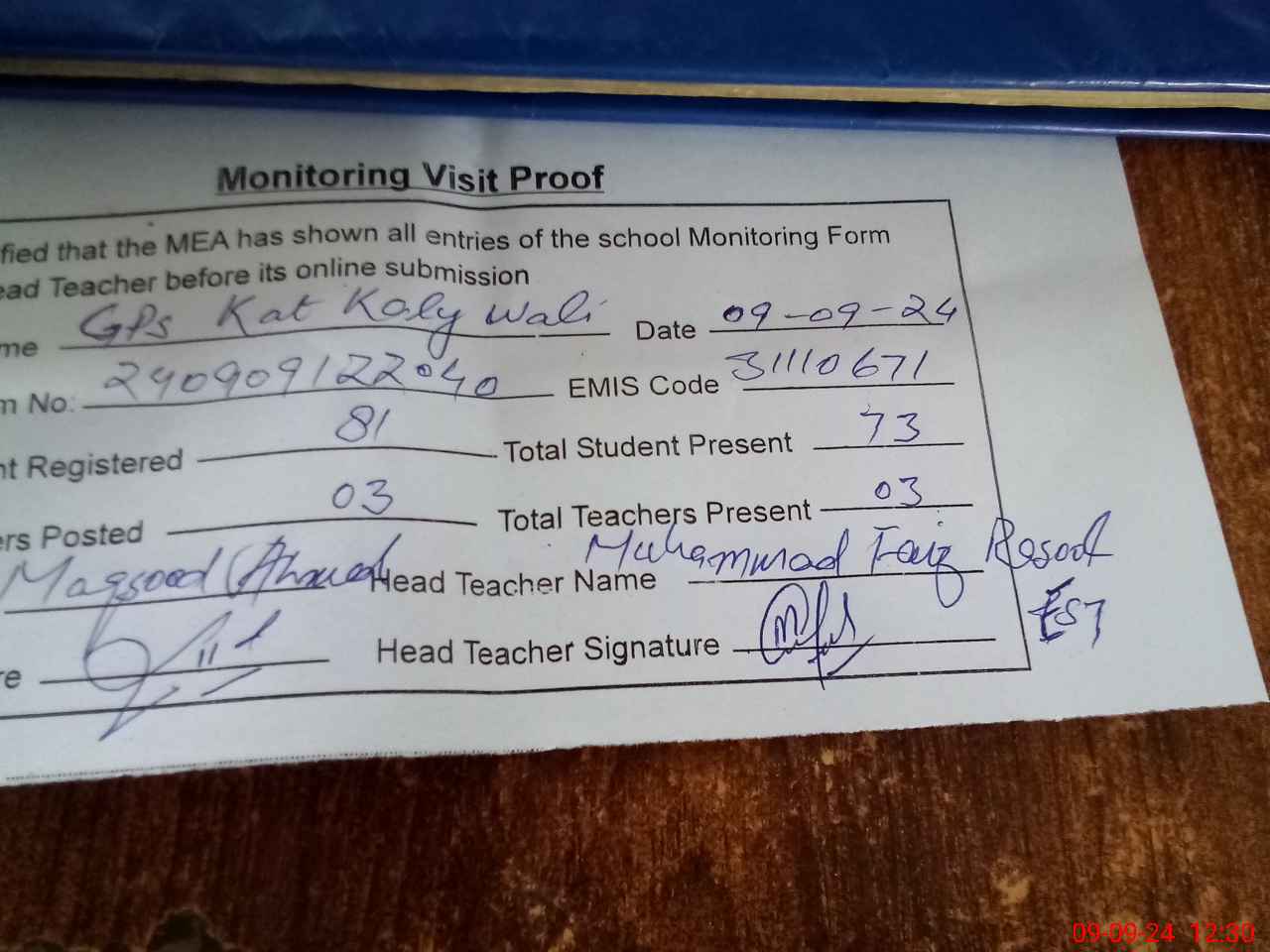 | Name: Kh**** Me**** Designation: (School Headmaster's/Headmistress's) EST Phone/Cell Number: 03**** |