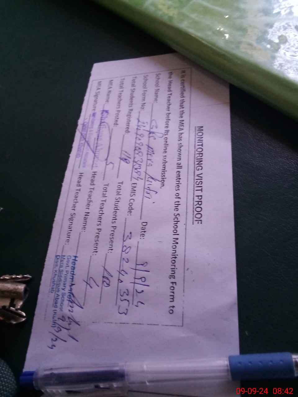 | Attendance Register | Head Teacher | MEA with School | Visit Proof |