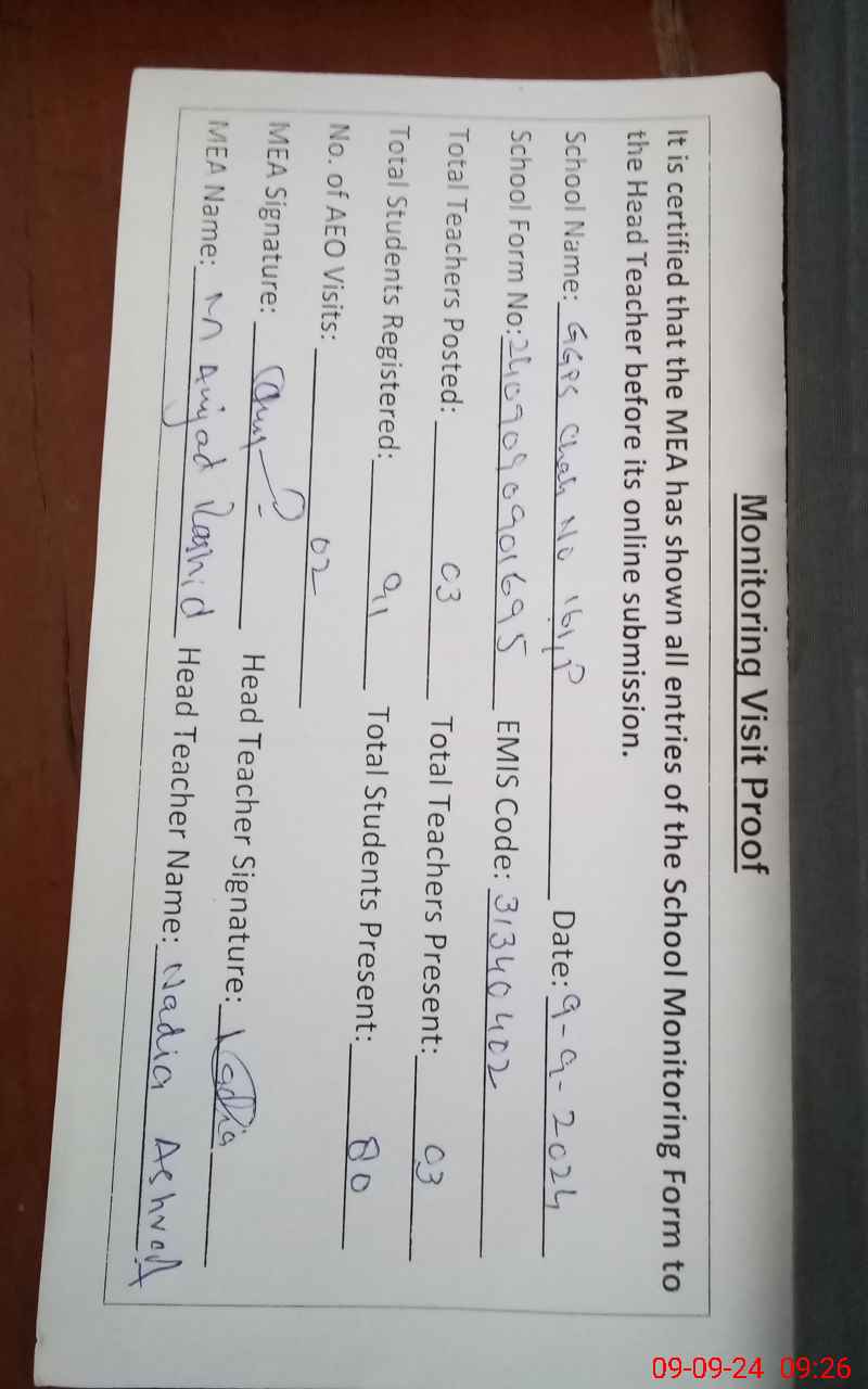 | Attendance Register | Head Teacher | MEA with School | Visit Proof |
