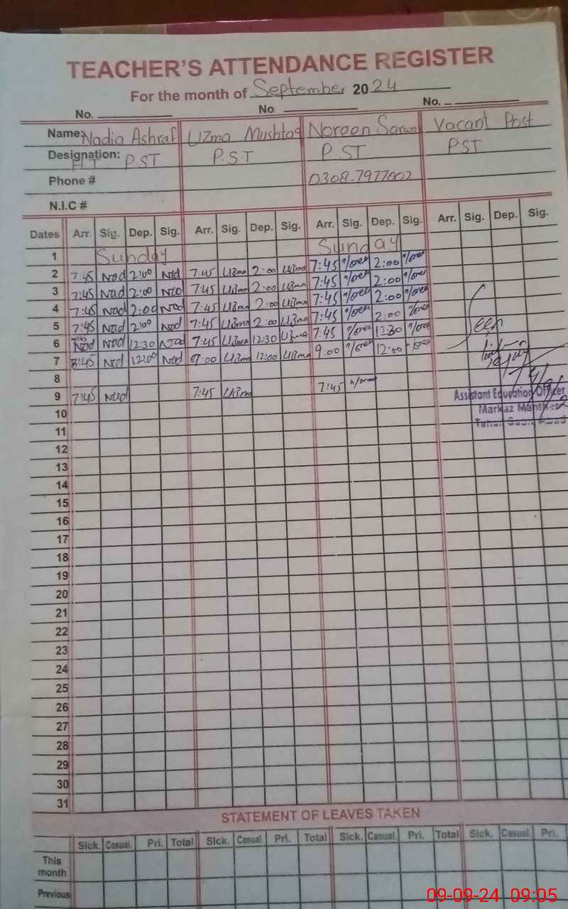 | Name: Uz**** Mu**** Designation: (School Headmaster's/Headmistress's) PST Phone/Cell Number: 03**** |