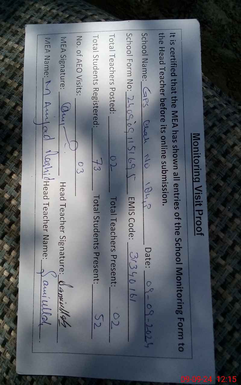 | Attendance Register | Head Teacher | MEA with School | Visit Proof |