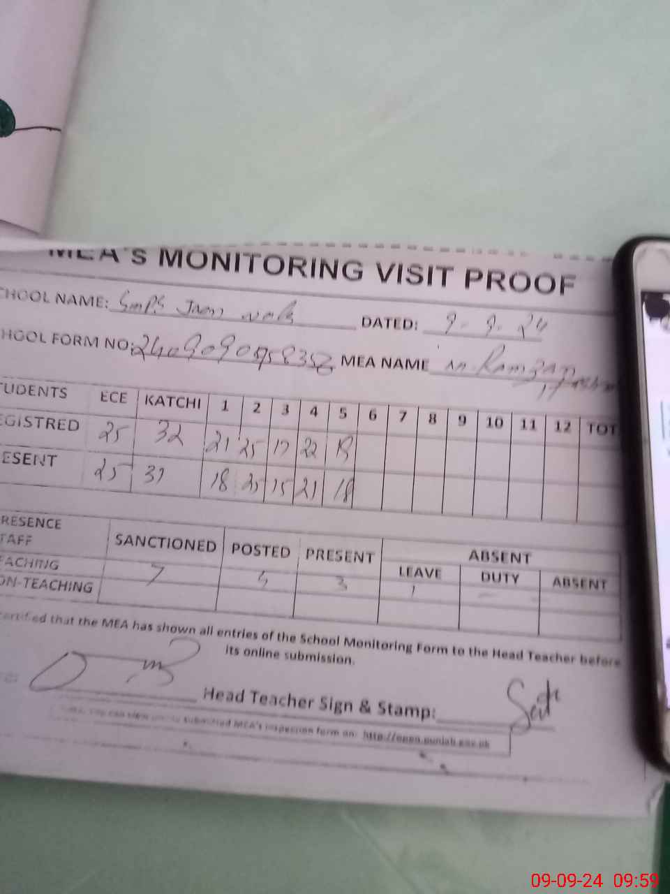 | Attendance Register | Head Teacher | MEA with School | Visit Proof |