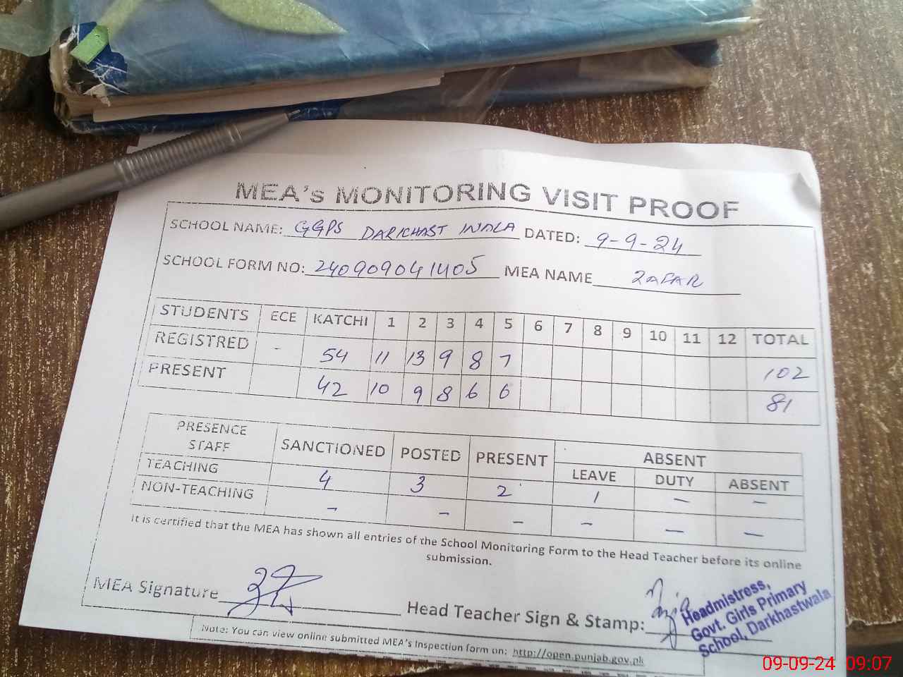| Attendance Register | Head Teacher | MEA with School | Visit Proof |