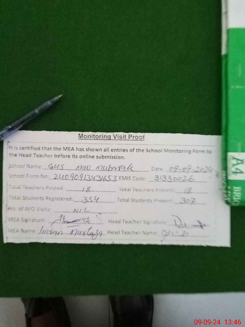 | Attendance Register | Head Teacher | MEA with School | Visit Proof |