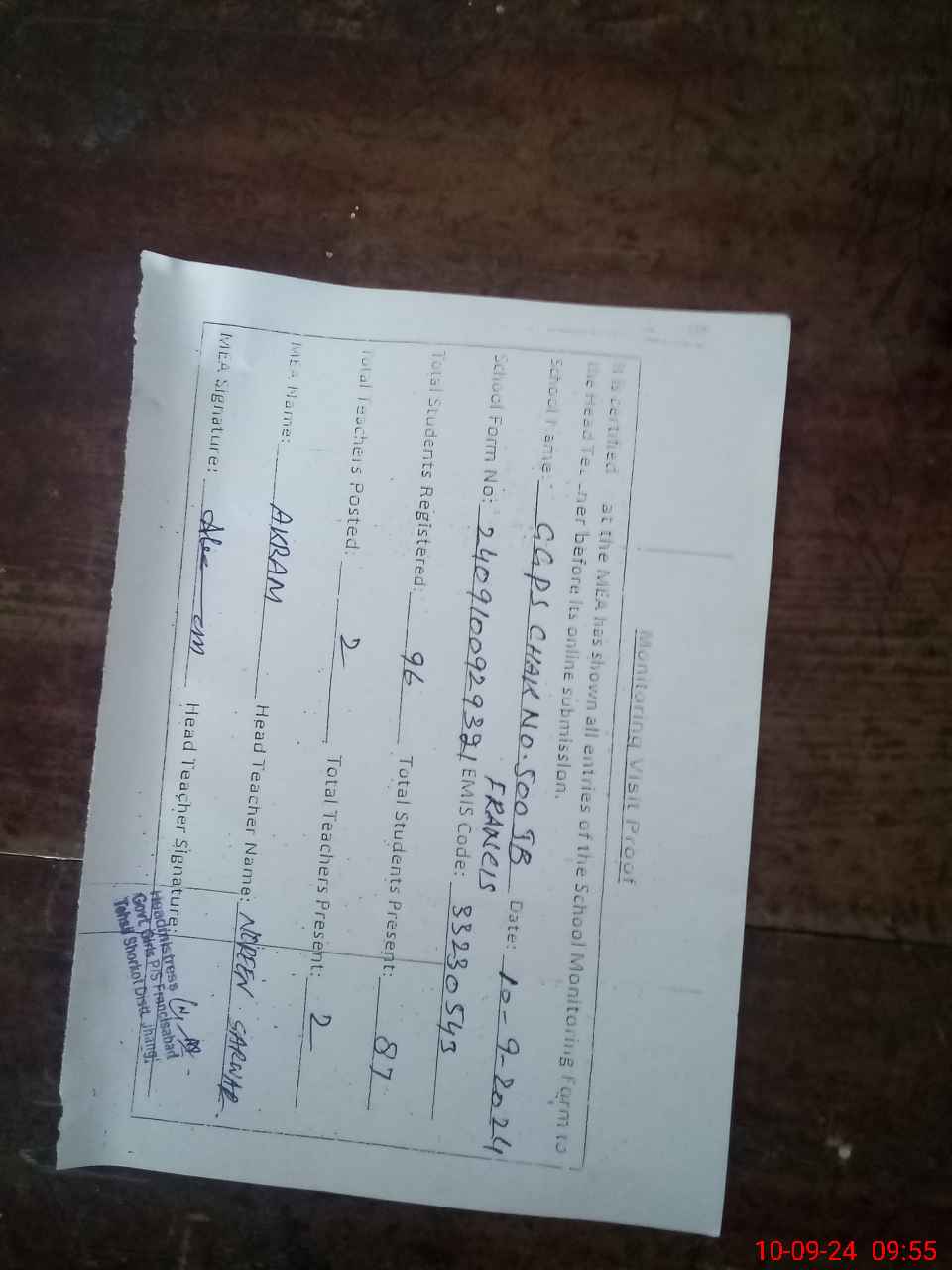 | EMIS Code: 33230543 | Name of School: GGPS CHAK NO 500 JB FRANCIS ABAD | |||