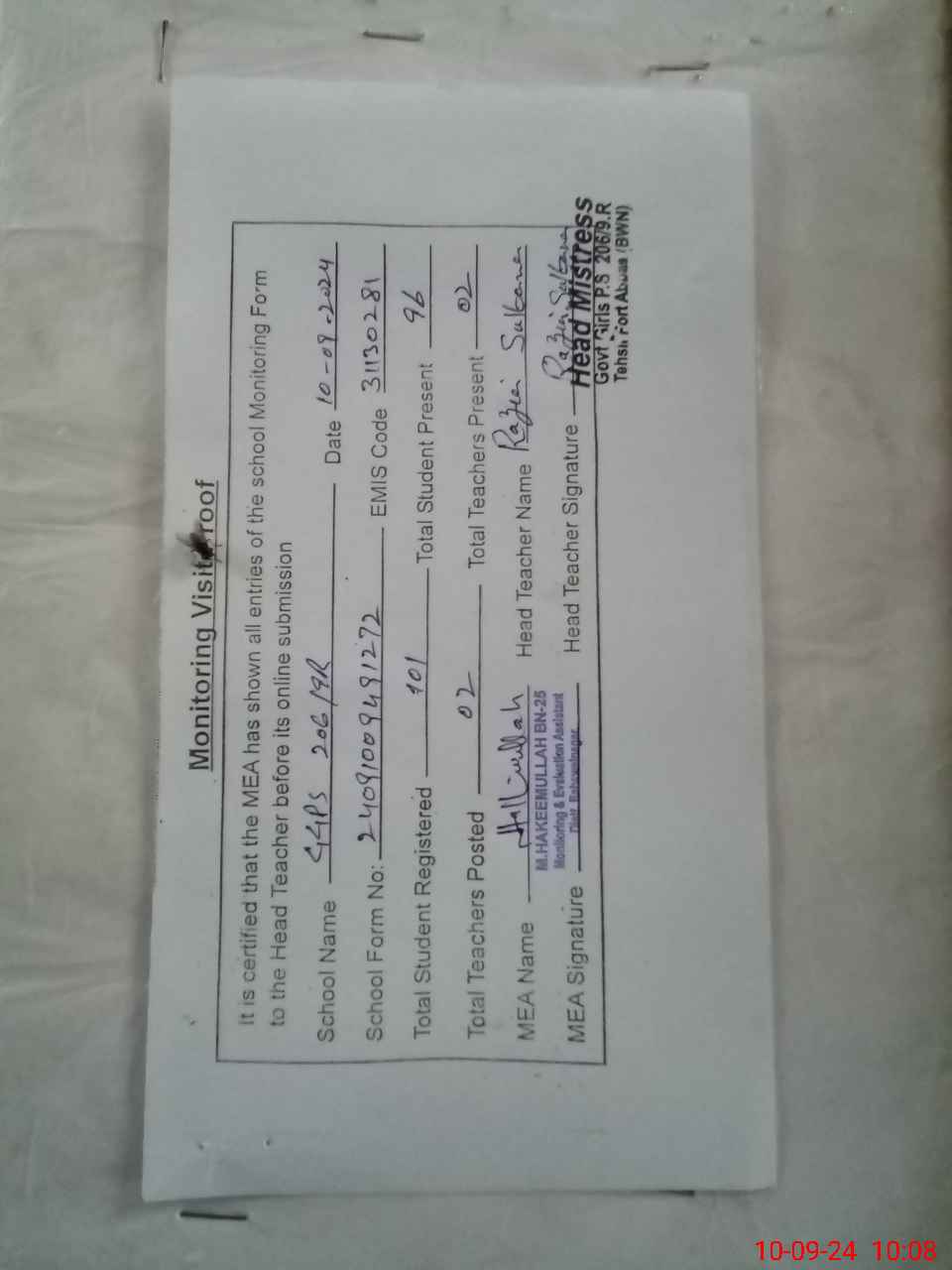 | Certified that this School was Inspected by the Undersigned MEA/DMO Today and the Information Stated Above is as Per Record. | |||||