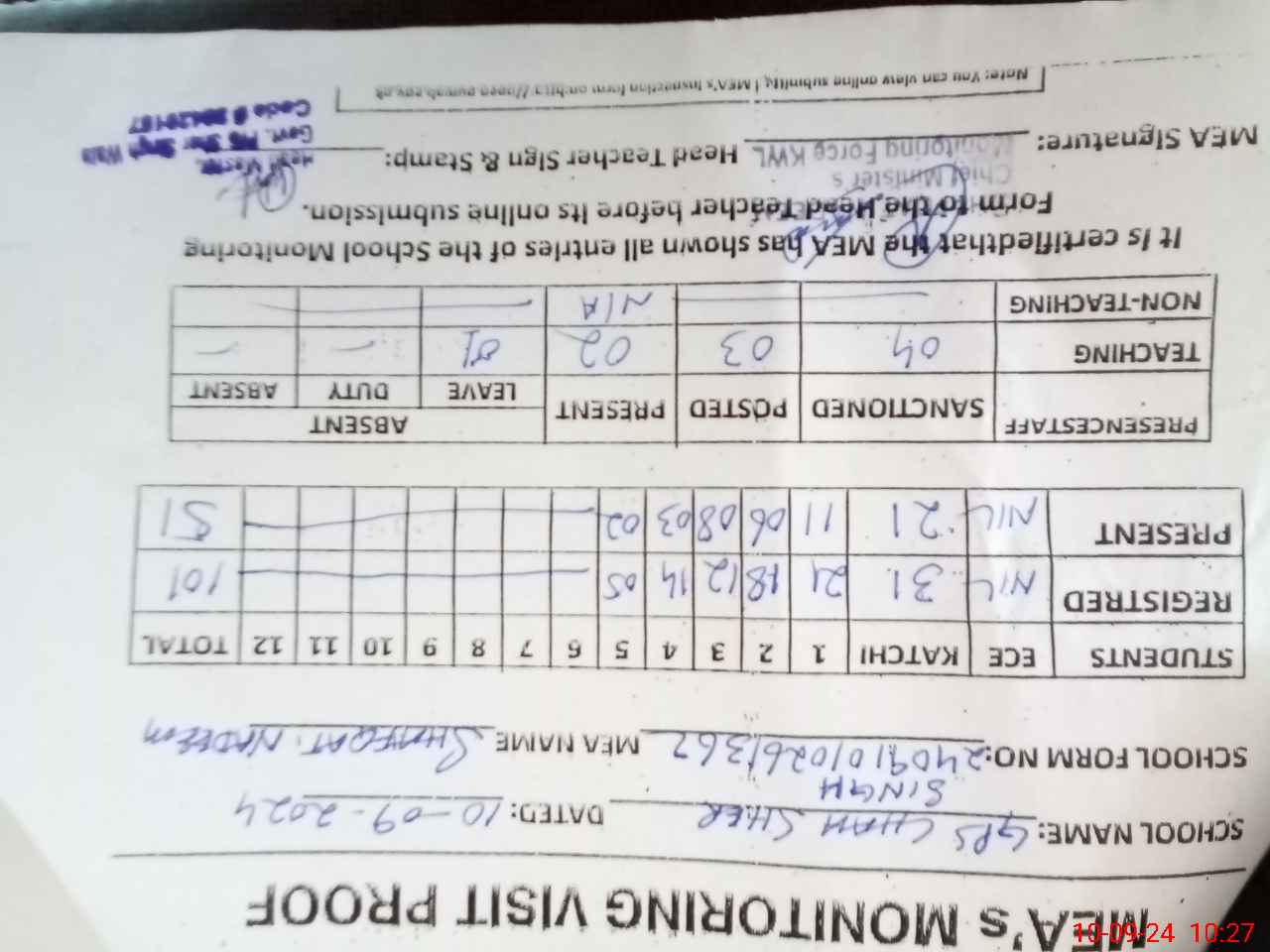 | Attendance Register | Head Teacher | MEA with School | Visit Proof |