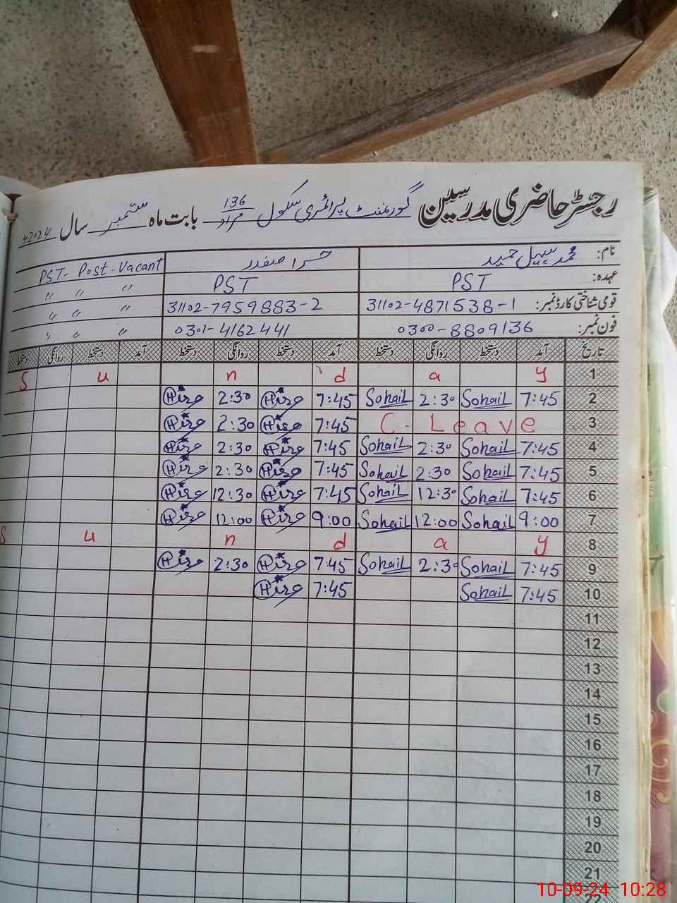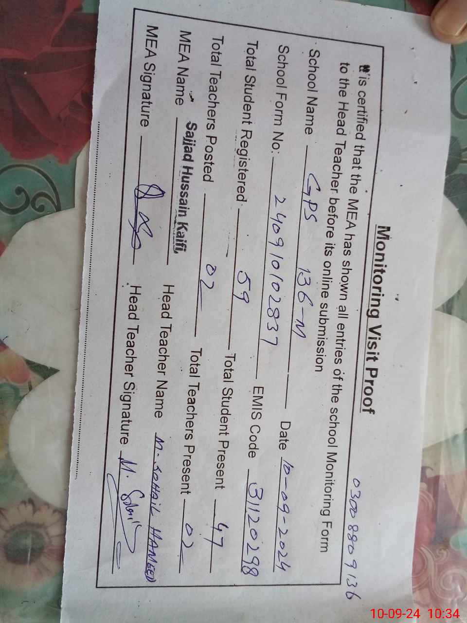| Name: MU**** So**** Ha**** Designation: (School Headmaster's/Headmistress's) PST Phone/Cell Number: 03**** |