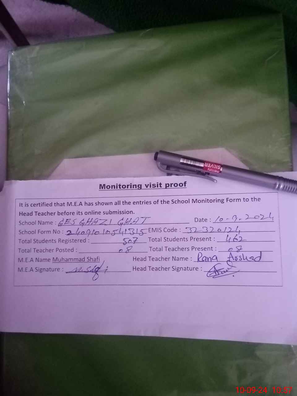 | Attendance Register | Head Teacher | MEA with School | Visit Proof |