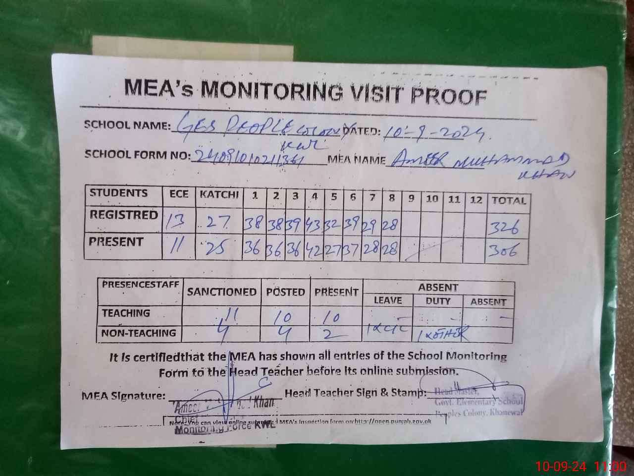| Attendance Register | Head Teacher | MEA with School | Visit Proof |