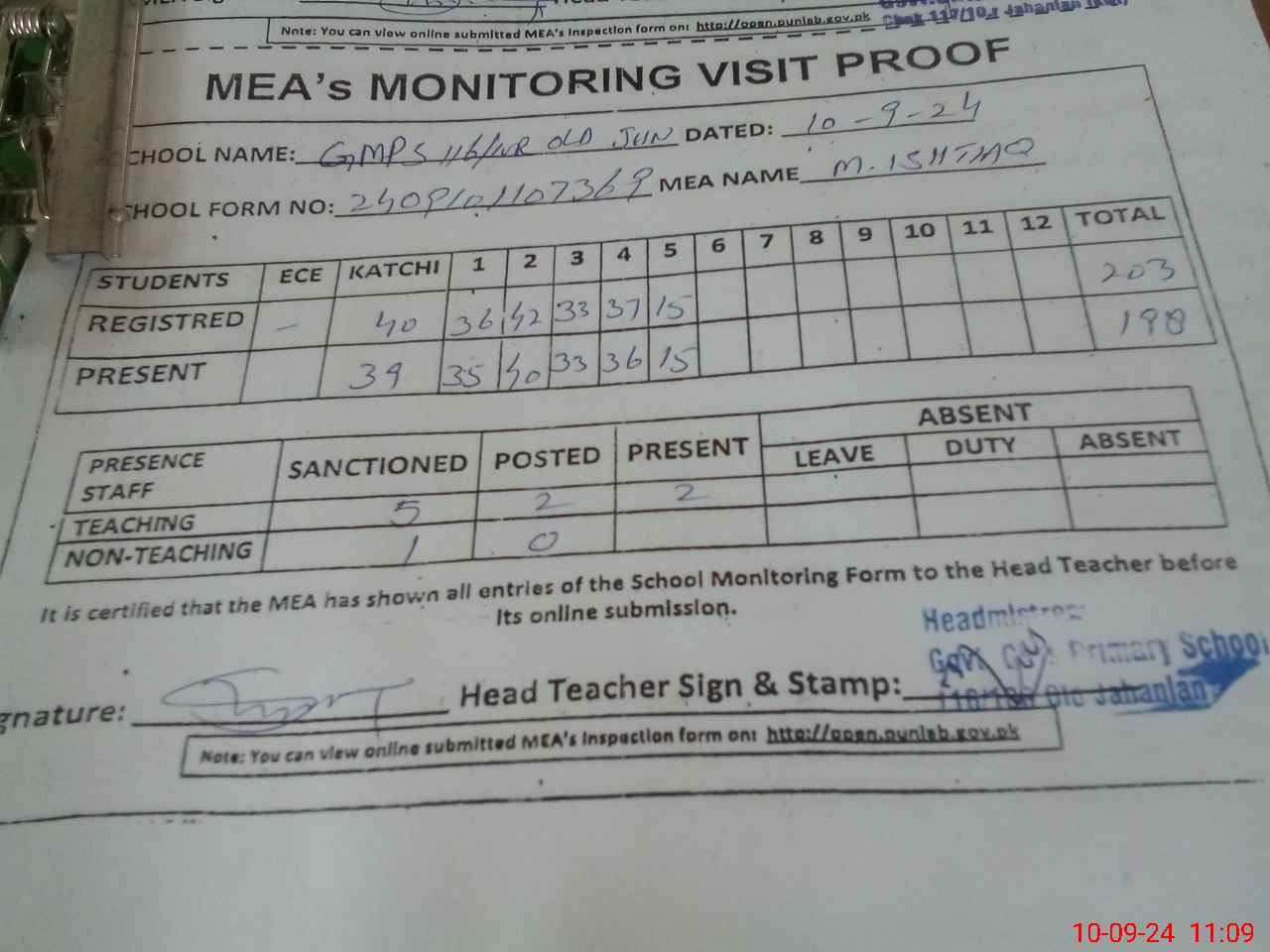 | Certified that this School was Inspected by the Undersigned MEA/DMO Today and the Information Stated Above is as Per Record. | |||||
