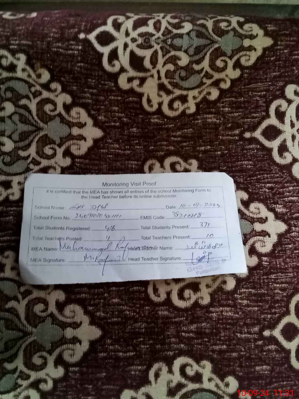 | Certified that this School was Inspected by the Undersigned MEA/DMO Today and the Information Stated Above is as Per Record. | |||||