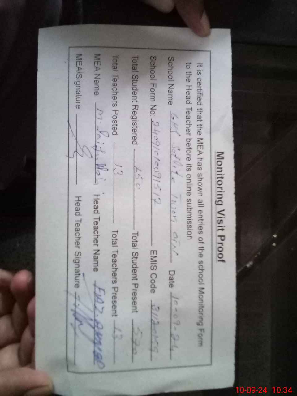 | Attendance Register | Head Teacher | MEA with School | Visit Proof |