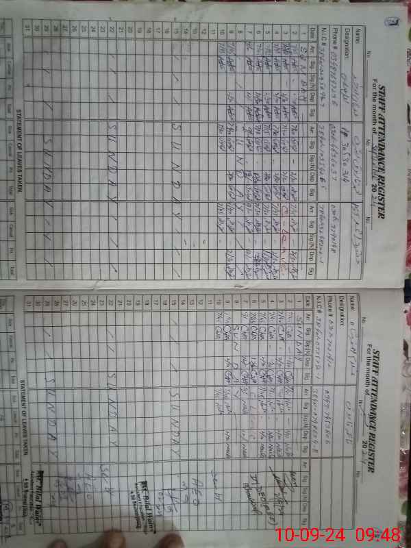 | CNIC | Full Name | Designation | R/C | Absence During Last Calender Month |